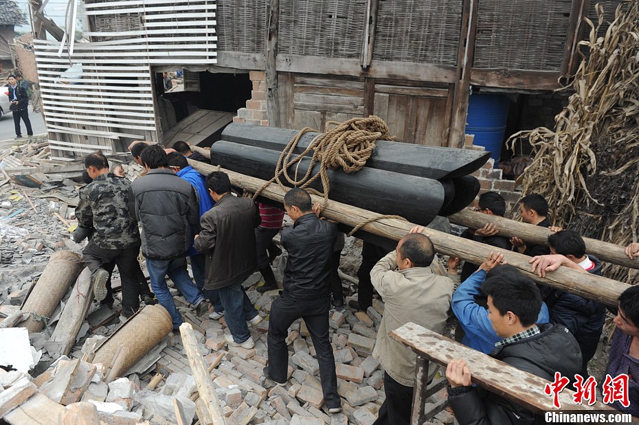 雅安芦山地震:从废墟上踏过的送葬队伍
