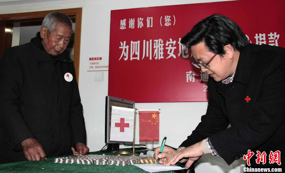 2013年04月21日,江苏省南通市,中国好人、慈善双雄之一的“磨刀老人”吴锦泉得知四川芦山地震消息后,来到江苏省南通市红十字会捐款。老人将两年来磨刀积攒的一元硬币1714枚,五角硬币503枚,一角硬币7枚,共计1966.2元全部捐给灾区。红会工作人员对清点出的零钱进行登记。图片来源:王俊荣 摄 CFP视觉中国