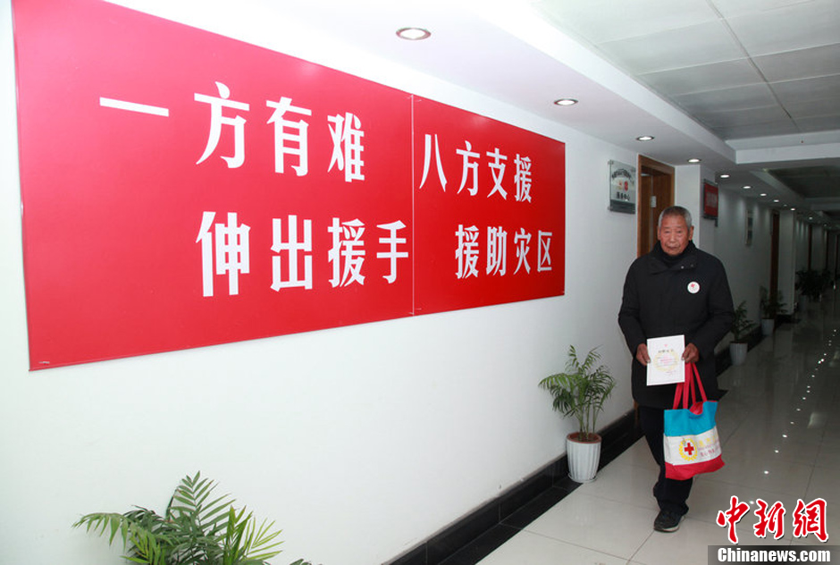 2013年04月21日,江苏省南通市,中国好人、慈善双雄之一的“磨刀老人”吴锦泉得知四川芦山地震消息后,来到江苏省南通市红十字会捐款。图片来源:王俊荣 摄 CFP视觉中国