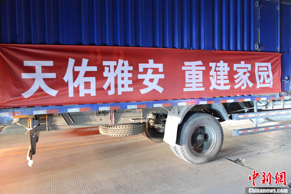 4月21日,在雅安芦山县路边车辆上的标语。中新社发 张元 摄