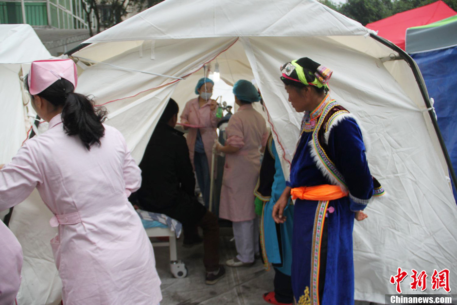 4月22日,雅安市第二人民医院迎来了地震来第三个忙碌的清晨。图为受伤的藏民正在帐蓬外聆听医生介绍伤情。高维峰 摄