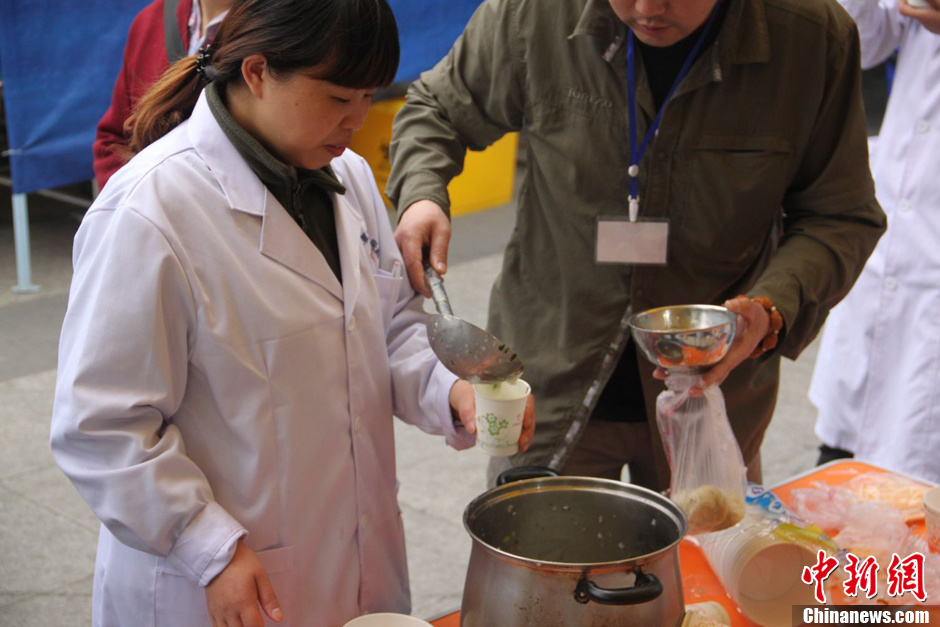 4月22日,雅安市第二人民医院迎来了地震来第三个忙碌的清晨。图为志愿者正在为雅安市第二人民医院的医护人员提供早餐。高维峰 摄