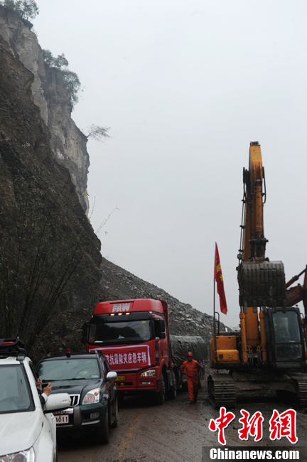4月22日,雅安巿宝兴县至五龙、明礼、陇东、永富?四个乡镇道路已全部抢通,便道通行。至此,宝兴县城通往各乡镇的公路全部抢通,救援车辆顺利进入灾区。中新社发 陈超 摄