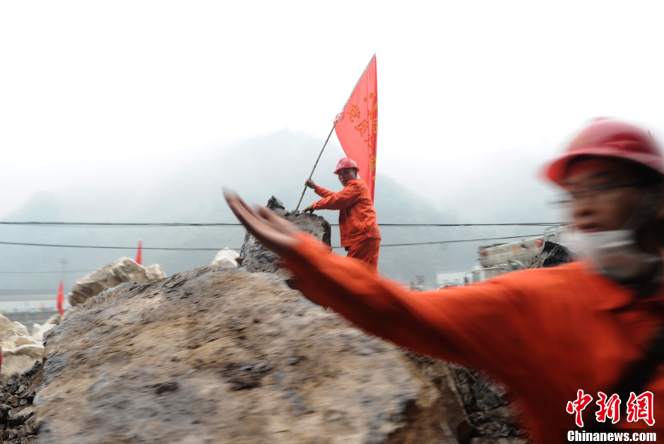 4月22日,地震灾区宝山县至灵关镇的公路首次打通,部分救援车辆顺利进入。图为一救援人员在山体塌方地段指挥救援车辆的通行。中新社发 陈超 摄