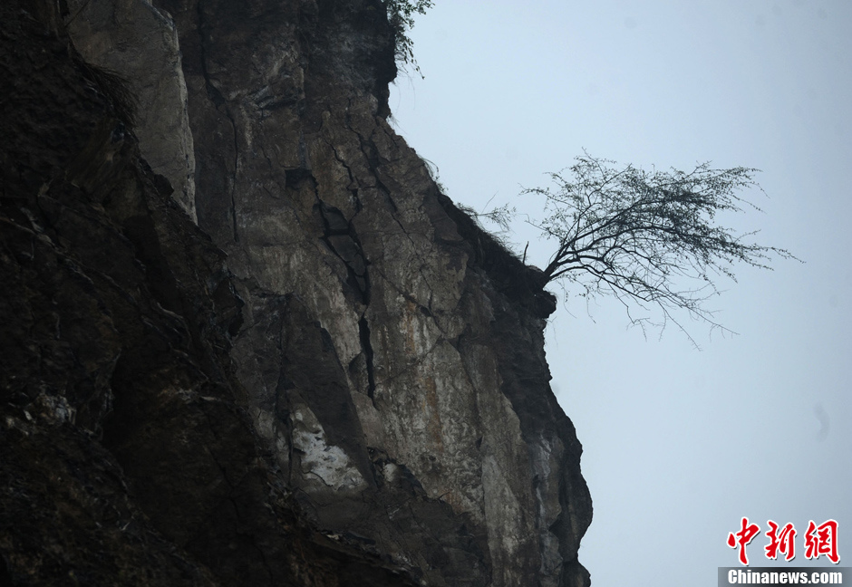 4月22日,四川雅安市芦山县到宝兴县地震灾区路段多处塌方,山崖上的树木岌岌可危。中新社发 陈超 摄