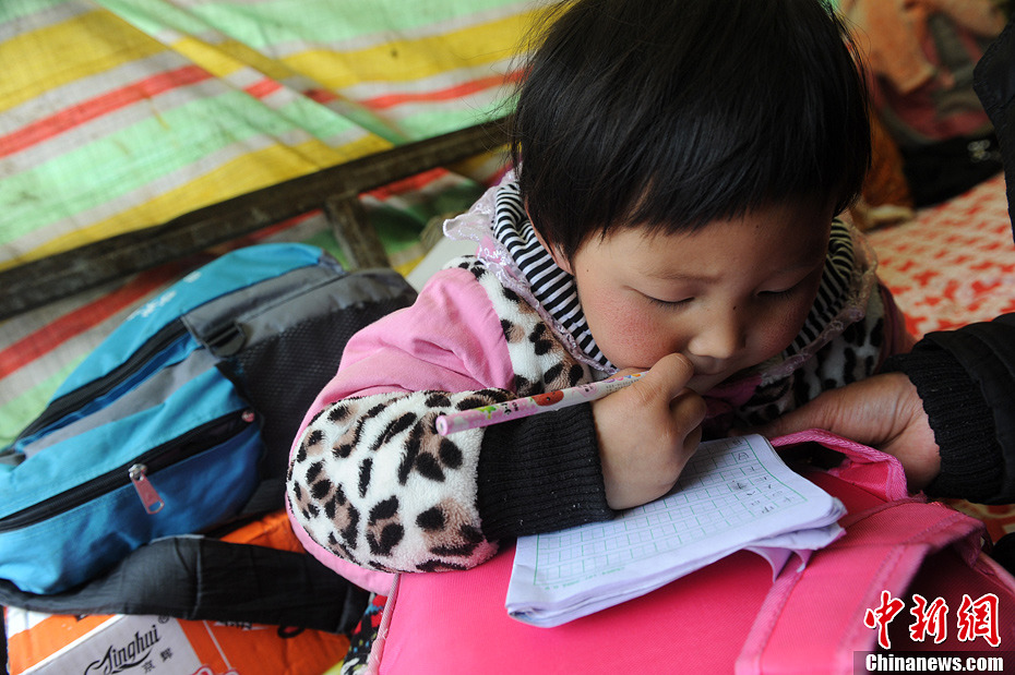 4月22日,四川芦山“4·20”强烈地震发生后的首个上课日,双石小学因震损毁严重,孩子们无法正常行课,不得不在临时搭建的简易帐篷中学习。图为小女孩乐欣雨在用货车改造的简易棚里做作业。中新社发 张浪 摄