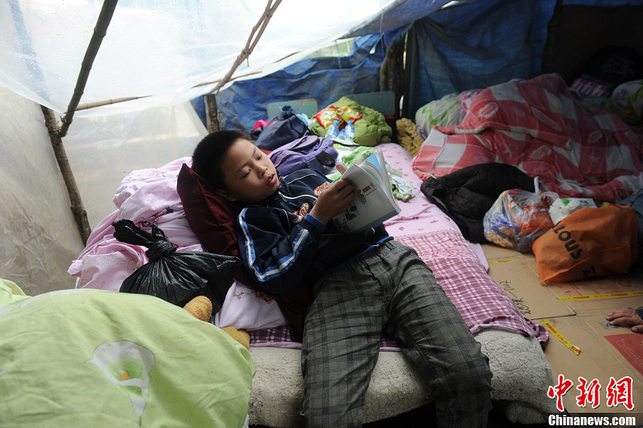 四川芦山地震:孩子们在简易帐篷中学习