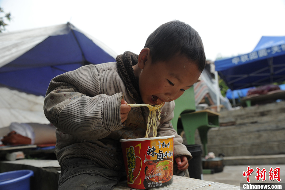 4月22日,四川雅安芦山双石镇双河村,一小男孩大口吃着方便面。中新社发 张浪 摄
