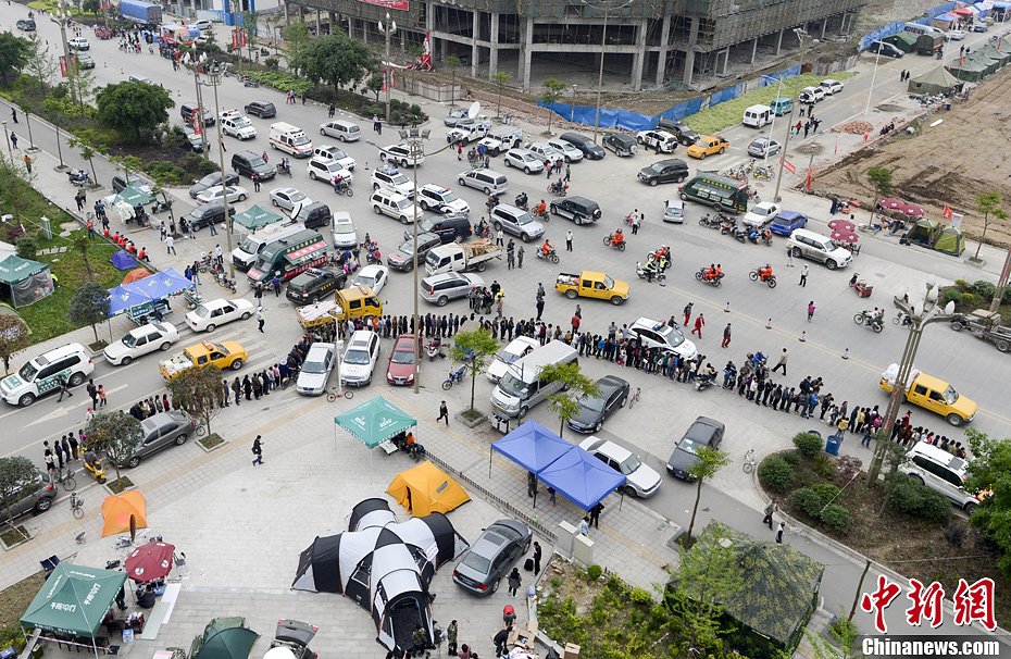 4月22日,四川芦山地震灾区社会秩序进一步恢复,在芦山县城灾民在各种稀缺资源面前自觉排队。受灾民众排长队领取帐篷伞。中新社发 廖攀 摄