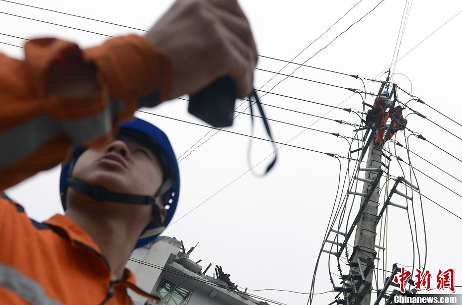 4月22日,四川芦山地震灾区,电力公司员工紧张修复电力设施。廖攀 摄