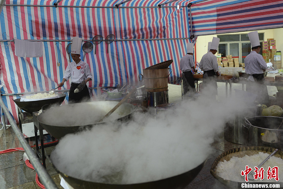 4月22日,四川芦山地震灾区,支援灾区的餐饮企业在为灾民做饭。廖攀 摄