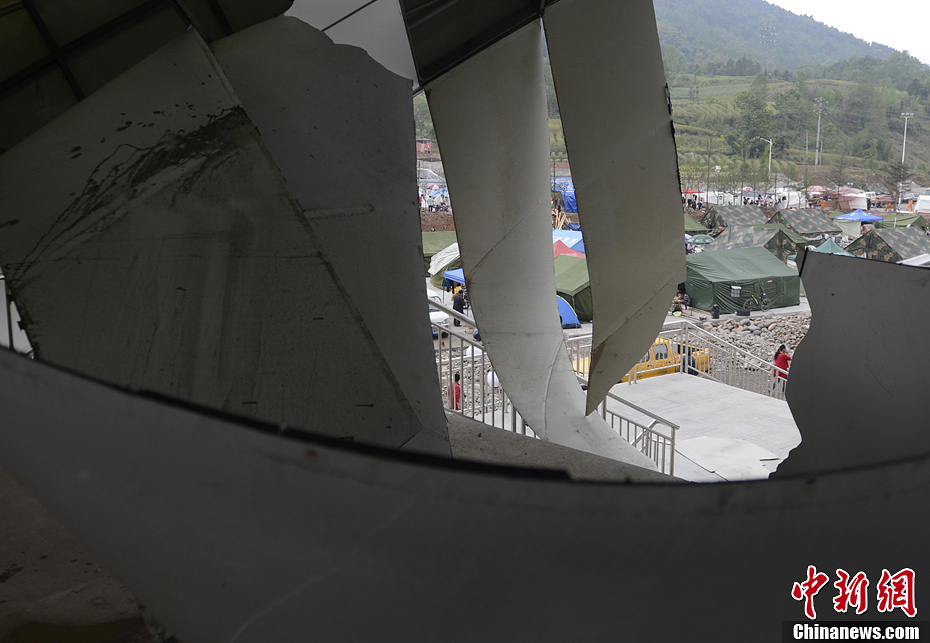受损的芦山体育馆和抗震帐篷