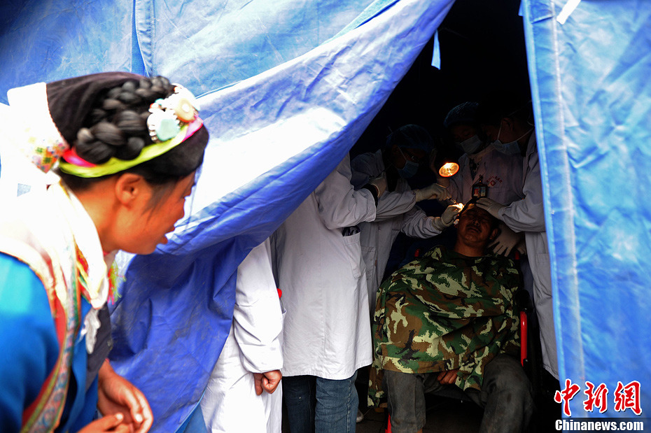 4月22日,地震灾区四川雅安市宝兴县余震导致部分民众再次受伤。图为一少数民族民众在临时医疗点接受治疗。中新社发 陈超 摄
