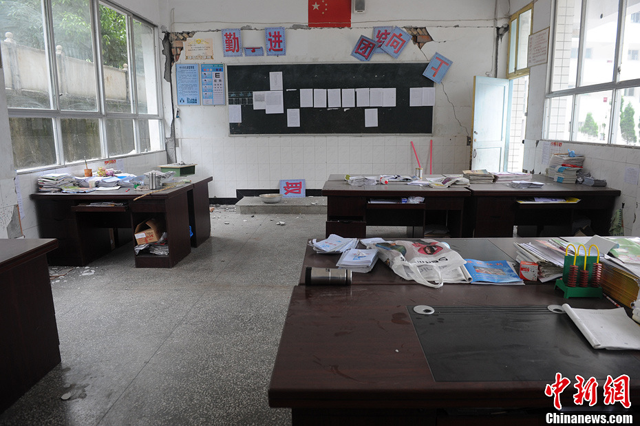 “4.20”芦山强震发生后,灾区教学楼损毁严重,成为危楼,学生不能正常行课,教室空荡如也。在芦山县双石小学,教室里一些课桌被灾区民众搬到安置点,当临时课桌,让孩子能够继续学习。张浪 摄
