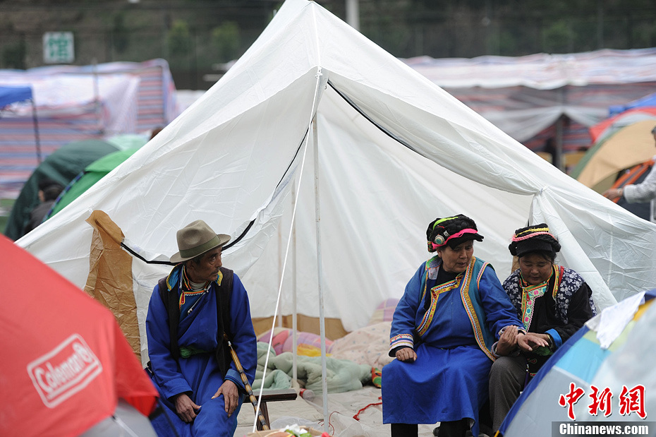 4月22日,地震灾区四川雅安市宝兴县民众聚集在体育场内的安置点。图为少数民族受灾民众在临时帐篷外聊天。中新社发 陈超 摄