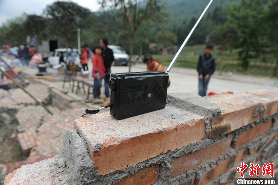 4月22日,四川雅安芦山双石镇地震灾区,一台滚动播放地震消息的收音机被搁置在废墟上,民众用它了解最新情况。中新社发 张浪 摄