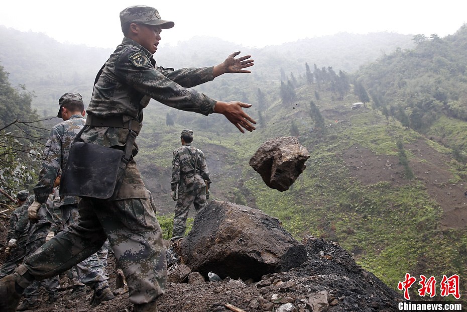 4月22日下午3时许,四川芦山地震太平镇钟晶村一处悬崖,战士们正在清理塌方石块,准备营救已经在石块下被埋超过55个小时的一名48岁的男子。目前山上不时还有石块坠落,已有战士受伤,但剩余战士准备一直坚持到底。中新社发 张浩 摄