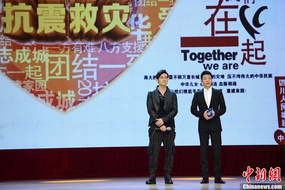 4月22日,周杰伦为雅安芦山灾区捐出100万后,也将电影的宣传活动搁置,原定在北京大学举办的周杰伦导演电影《天台》发布会活动取消,变更为"心系雅安芦山?4?22北大正能量传递活动",这是周杰伦在得知震情后当即做出的决定。周杰伦与主持人撒贝宁一起,完成了这次关于“传递正能量”的对话,与北京大学生一起,为灾区人们加油打气,守望相助他们重建美好的家园。图为周杰伦、撒贝宁。中新社发 李学仕 摄