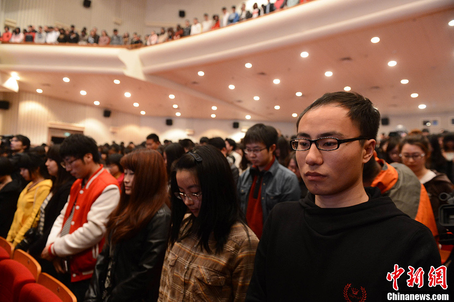 4月22日,周杰伦为雅安芦山灾区捐出100万后,也将电影的宣传活动搁置,原定在北京大学举办的周杰伦导演电影《天台》发布会活动取消,变更为"心系雅安芦山?4?22北大正能量传递活动",这是周杰伦在得知震情后当即做出的决定。周杰伦与主持人撒贝宁一起,完成了这次关于“传递正能量”的对话,与北京大学生一起,为灾区人们加油打气,守望相助他们重建美好的家园。图为北大学子集体起立默哀。中新社发 李学仕 摄