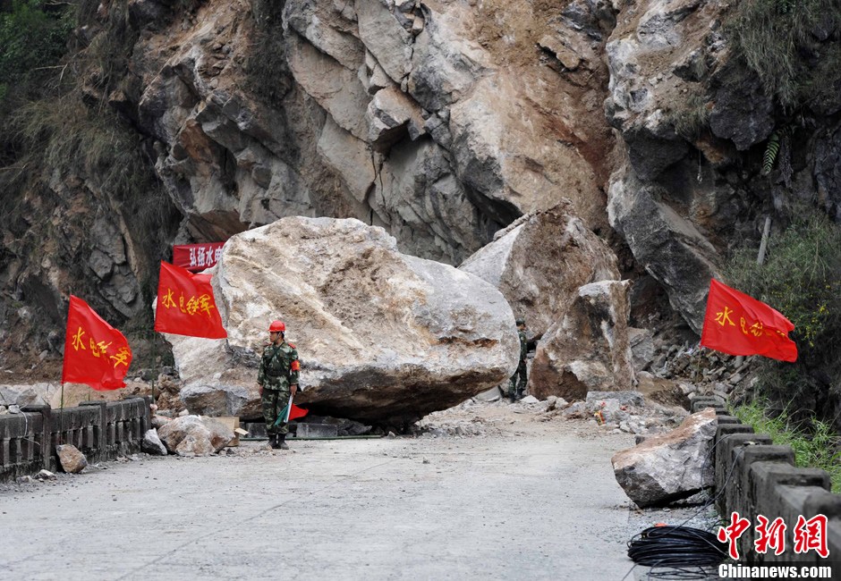 直击芦山县宝盛乡堵塞道路巨石爆破