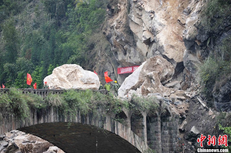 直击芦山县宝盛乡堵塞道路巨石爆破