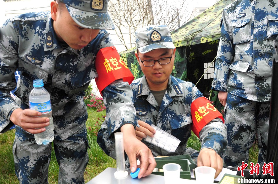 4月22日,成都军区空军后勤部防疫队进村入户开展防疫工作,对受灾群众进行挨家挨户排查并进行环境消毒,消毒面积共计8000余平方米。图为医生张彪对水源水质进行严格检测。 于雷 摄