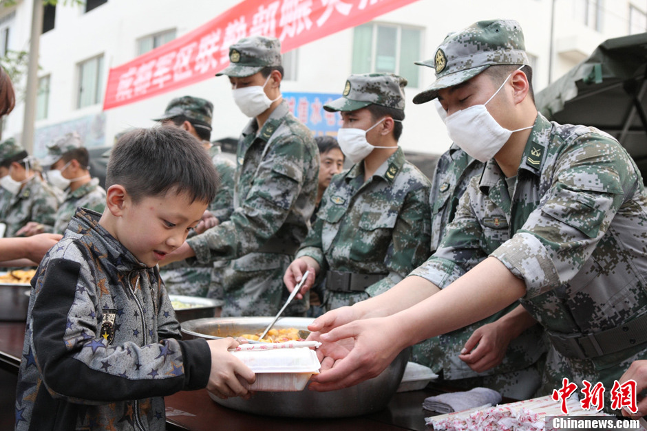 4月22日,在地震灾区芦山县的成都军区某部赈灾热食供应站,一位小朋友乐享正规“军饭”。中新社发 史元丰 摄