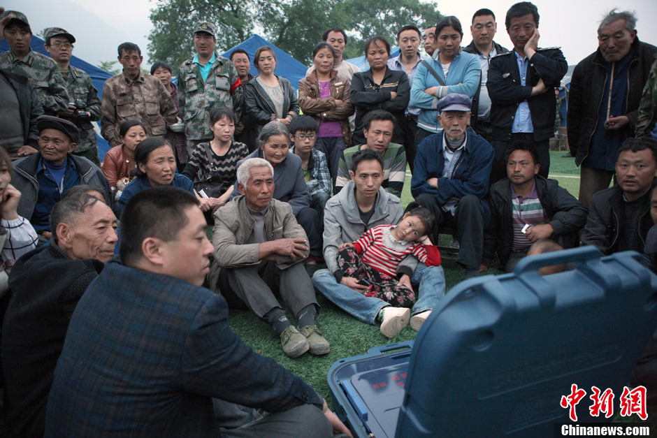 4月22日,芦山县龙门乡的地震灾民安置点内,受灾民众围坐在卫星电视前关注灾情。中新社发 史元丰 摄