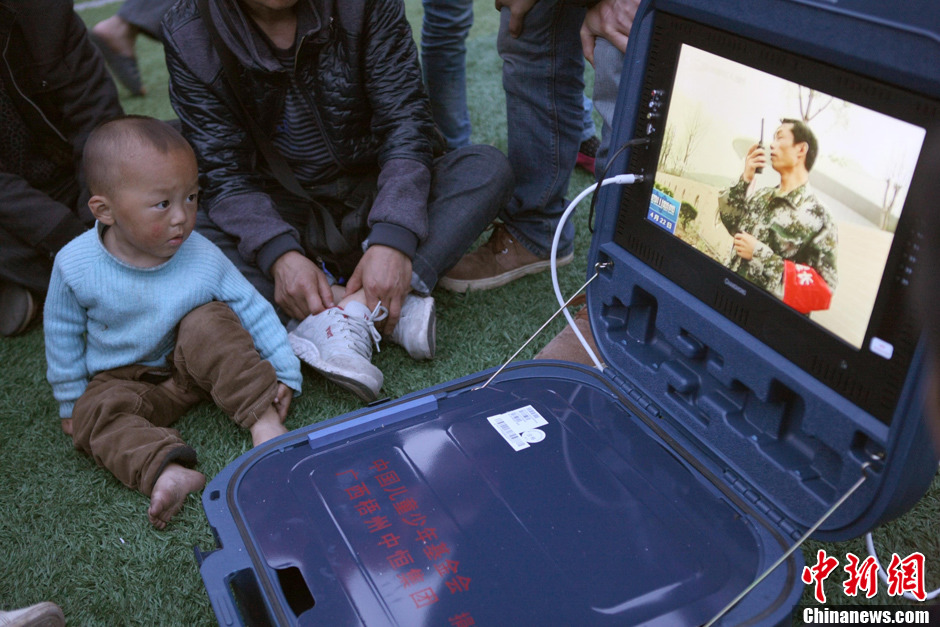 4月22日,芦山县龙门乡的地震灾民安置点内,受灾民众围坐在卫星电视前关注灾情。图为一名小朋友被电视中的救援战士吸引。中新社发 史元丰 摄