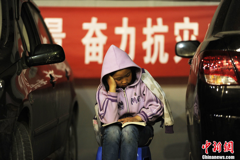 4月22日,地震灾区四川雅安宝兴县安置区一小女孩在深夜里努力看书学习。中新社发 陈超 摄