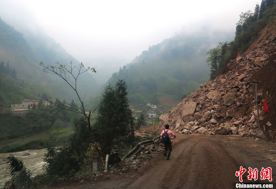 4月22日,灵关镇到宝兴县的道路上随处可见飞石泥沙滑落。中新社发 李安江 摄