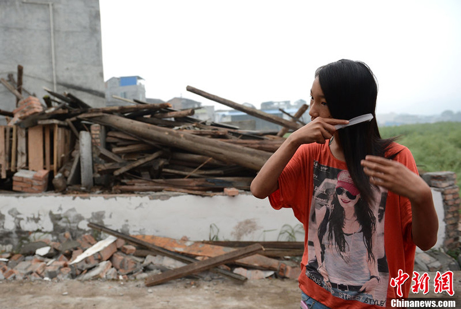 4月22日,雅安龙门乡,受灾群众在废墟前梳头。王效 摄 图片来源:CFP视觉中国