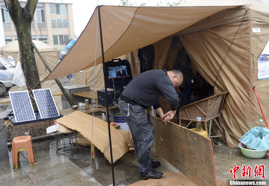 4月23日,四川芦山地震灾区降下小雨,芦山中学安置点帐篷配备了太阳能电池和电视。中新社发 廖攀 摄