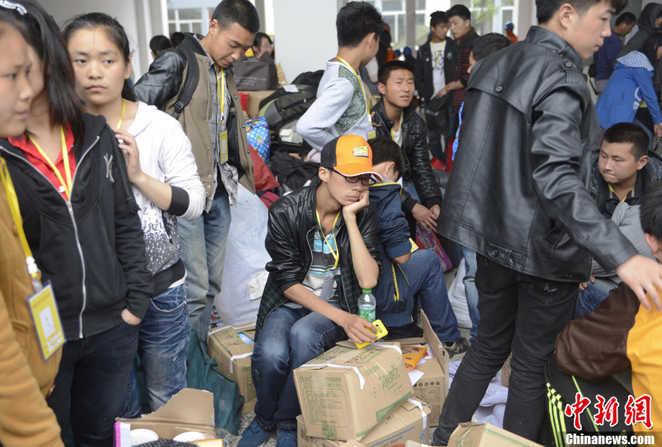 4月23日,四川芦山地震灾区降下小雨,芦山中学高三学生等待西南财经大学组织车辆将他们接往该校复课。中新社发 廖攀 摄