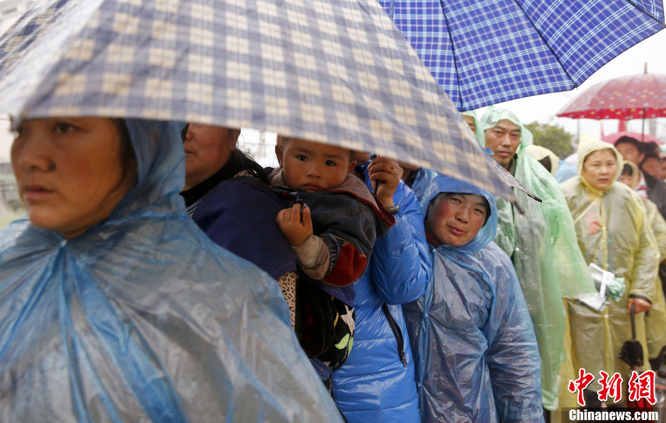 4月23日晨,四川芦山地震灾区降下中雨,龙门镇众多没有住进专用帐篷的村民纷纷来到志愿者物资发放处领遮雨用的彩条布。中新社发 张浩 摄