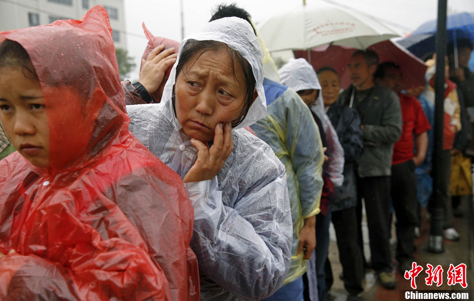 4月23日晨,四川芦山地震灾区降下中雨,龙门镇众多没有住进专用帐篷的村民纷纷来到志愿者物资发放处领遮雨用的彩条布。中新社发 张浩 摄