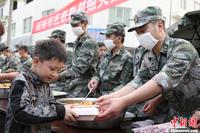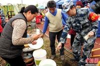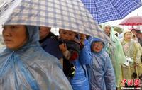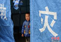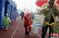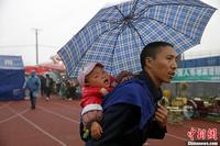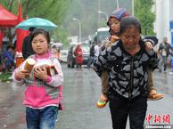 4月23日晨,四川芦山地震灾区降下中雨,龙门镇一处安置点的帐篷外,一位小朋友正准备跟着母亲一起去打水。中新社发 张浩 摄