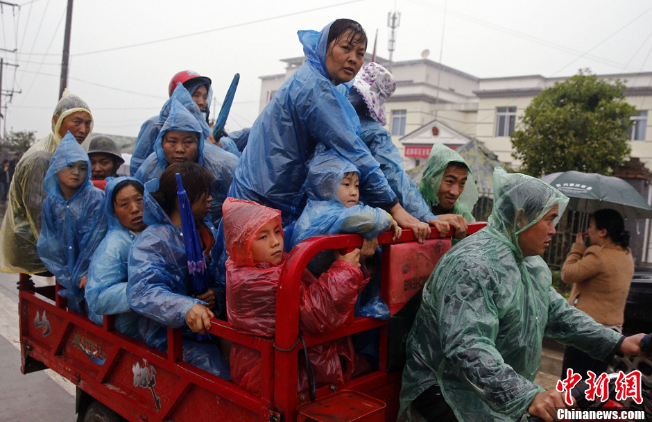 4月23日晨,四川芦山地震灾区降下中雨,龙门镇众多没有住进专用帐篷的村民纷纷来到志愿者物资发放处,领遮雨用的彩条布,图为一车人载着物资离开。中新社发 张浩 摄