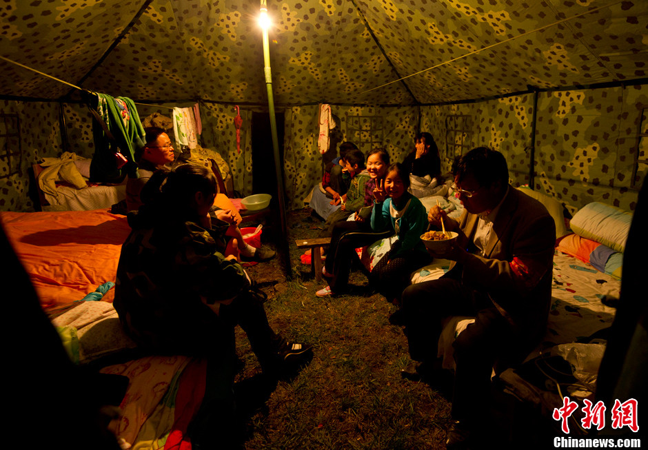 四川芦山7.0级强烈地震发生后,国家电网四川省电力公司第一时间启动地震应急预案,在开展生产自救的同时,组织各专业人员、共产党员服务队急驰灾区参与抗震救灾。到达灾区后,眉山电力抗震救灾突击队一方面参与电力线路、设备的事故勘查,同时带着发电机到各重要保电区及重灾区,为安置点内的民众架设照明线路,接上电灯,为灾区人民送去光明和希望。图为有了电,帐篷里传出了欢乐。黄峥 摄