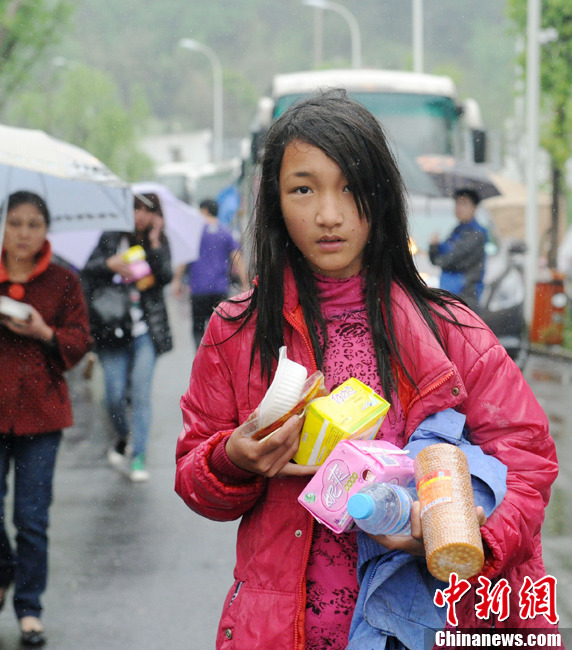 4月23日,四川芦山震灾区芦山中学灾民安置点内母亲带着孩子领取救灾食品。刘忠俊 摄
