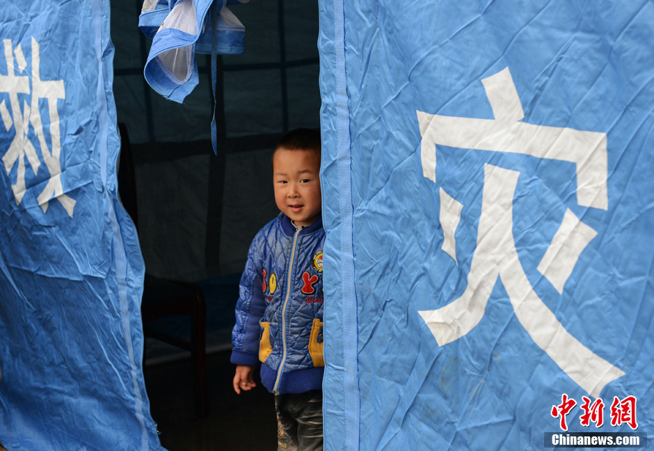 4月23日,在四川芦山县宝盛乡凤头村安置点救灾帐篷里5岁的廖坦城。地震发生时廖坦城还在床上,家人跑进房间把他抱了出来,全家无人受伤。张元 摄