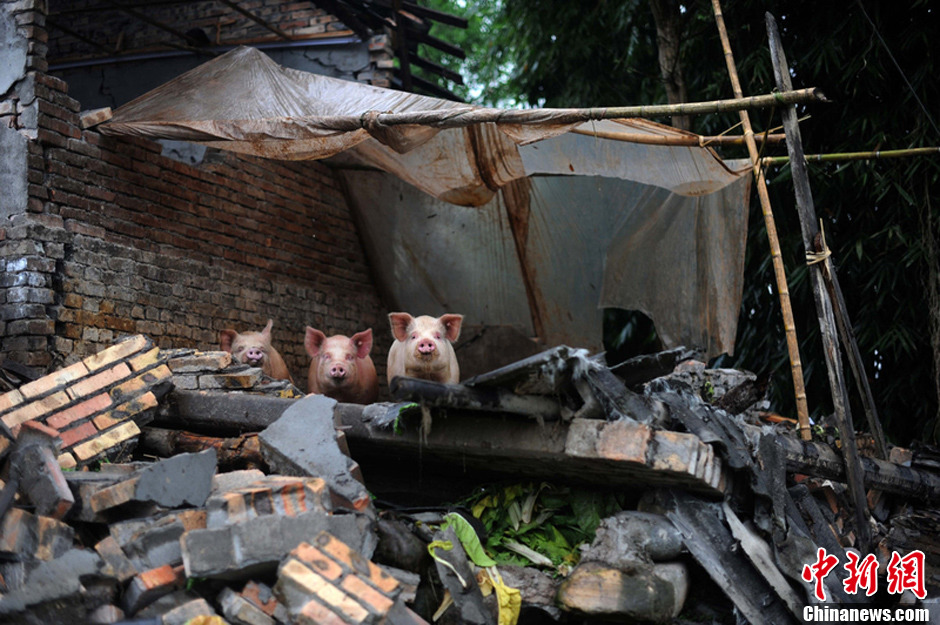 4月23日,在天全县仁义乡有三头猪一直守在自己倒塌的猪圈前。据其主人介绍,地震时,三头猪受伤而逃,他下山将三头猪赶回来并进行治疗后,三头猪日日守在倒塌的猪圈前不再肯离开。三头猪守在倒塌的猪圈前不肯离开。图片来源:东方IC 版权作品 请勿转载