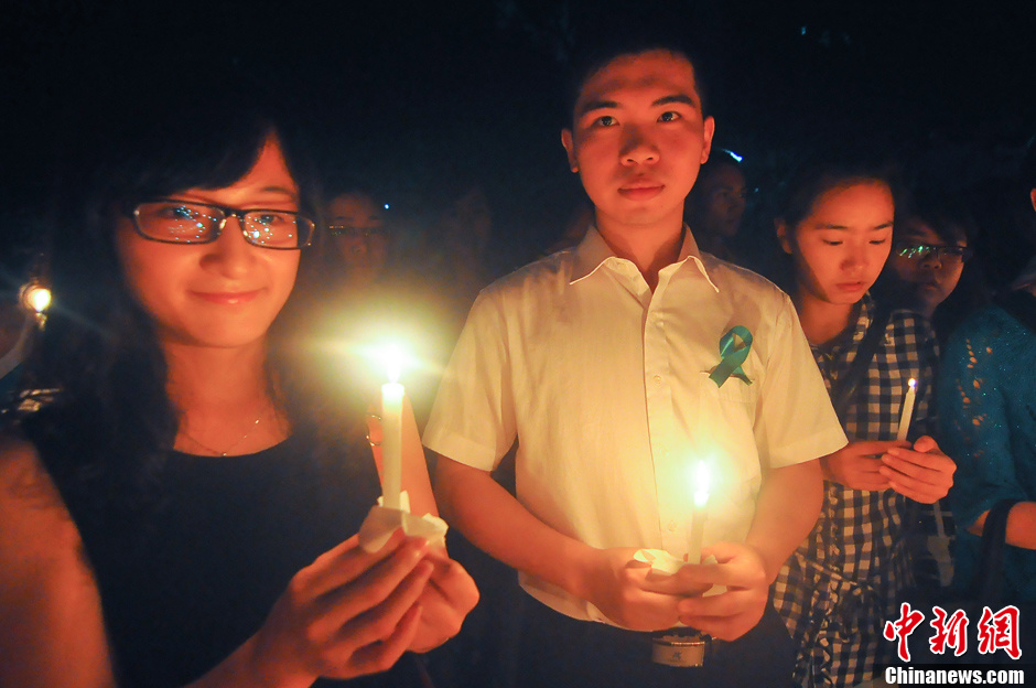 4月23日晚,广西民族大学近百名学生在校园内点起蜡烛摆成心形,并围在一起,为四川省芦山“4·20”7.0级地震灾区的受灾民众祈福。方冰冰 摄