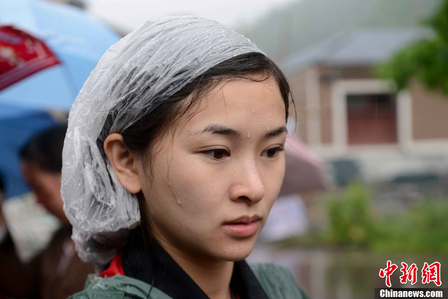 4月23日,四川雅安,汶川地震断腿女教师廖智在芦山为灾民服务。图为雨中忙活,廖智来不及擦拭脸上的雨水。蒲东峰 摄 图片来源:CFP视觉中国