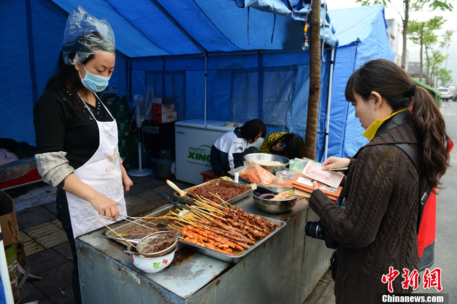 四川工商部门组织的生活必需品应急市场4月22日在芦山县城开始营业,水果、蔬菜、超市等生活必需品摊位恢复经营。摊主都是当地原来的经营户,在工商部门的号召下成立了应急市场。价格基本和地震前一样,甚至有些比地震前还便宜。图为4月23日,一名顾客正在购买烤肉。中新社发 张元 摄