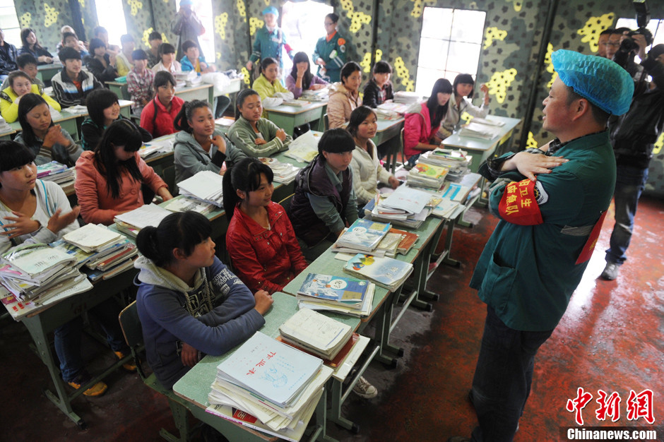 4月23日,四川芦山地震震中龙门乡首个帐篷学校开课,迎来了龙门乡晨阳希望学校的88位初三学生,这是芦山地震震中的第一所帐篷学校。四川绵阳第三医院的医生赵红为学生带来的心理辅导成为孩子们震后第一课。中新社发 张浪 摄