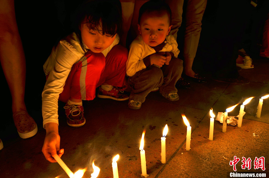 4月23日晚,四川达州数千民众自发汇聚到西外人民广场,点亮数百支蜡烛组成“4·20雅安平安”的心形圈,哀悼在芦山地震中的遇难同胞,并为灾区人民捐款祈福。张骥 摄