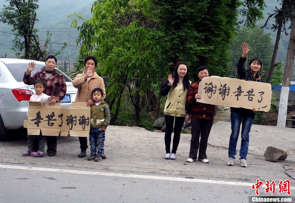 4月23日,四川雅安市至芦山县地震灾区救援通道两旁,灾区民众手举写有“谢谢”、“辛苦了”等字样的纸板,欢迎救援队伍和志愿者,感谢八方支援。中新社发 刘蛟 摄 图片来源:CNSPHOTO