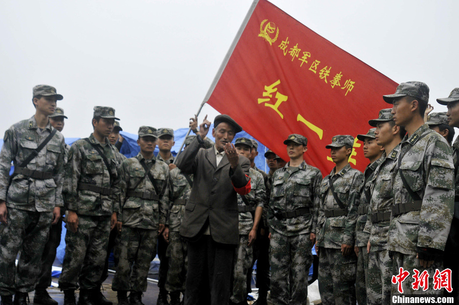 4月23日,第13集团军某团红一连官兵来到遭受地震灾害的天台县仁义乡红军村,投入救灾。图为一位当地70多岁的老红军为官兵讲红军故事。中新社发 彭小明 摄