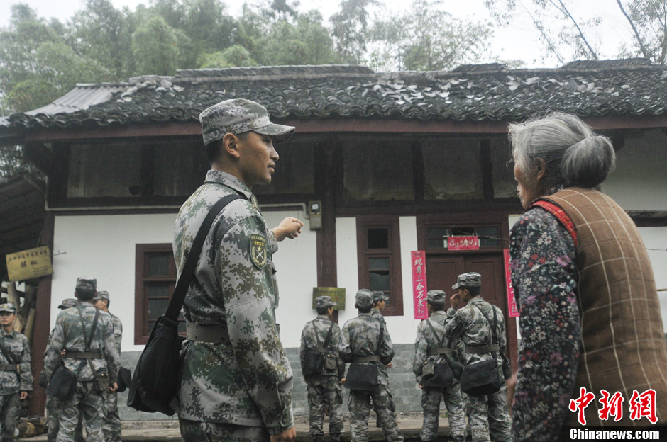 4月23日,第13集团军某团红一连官兵来到遭受地震灾害的天台县仁义乡红军村,投入救灾。图为红军村薛底莲老人和救灾官兵在红四方面军政治部遗址前。中新社发 彭小明 摄